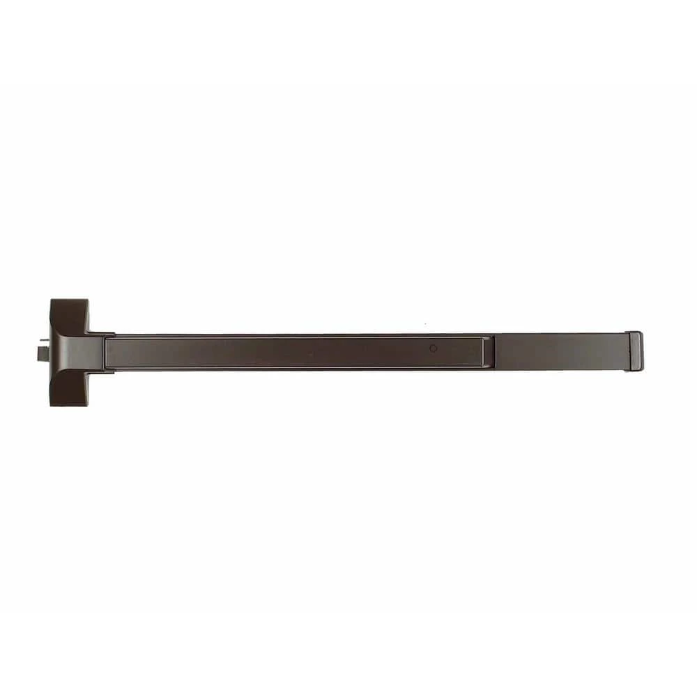Bulldog Standard Rim Exit Device. Fits all standard metal and wood doors 1-3/4 thick standard, 2-1/4 optional. Stainless steel, painted aluminum finish. Device compatible with 161-cutout on hollow metal doors. Stainless steel springs throughout. Black coated steel strikes. ANSI 156.2 grade-1. Non-handed design. 36 or 48 widths. UL listed.