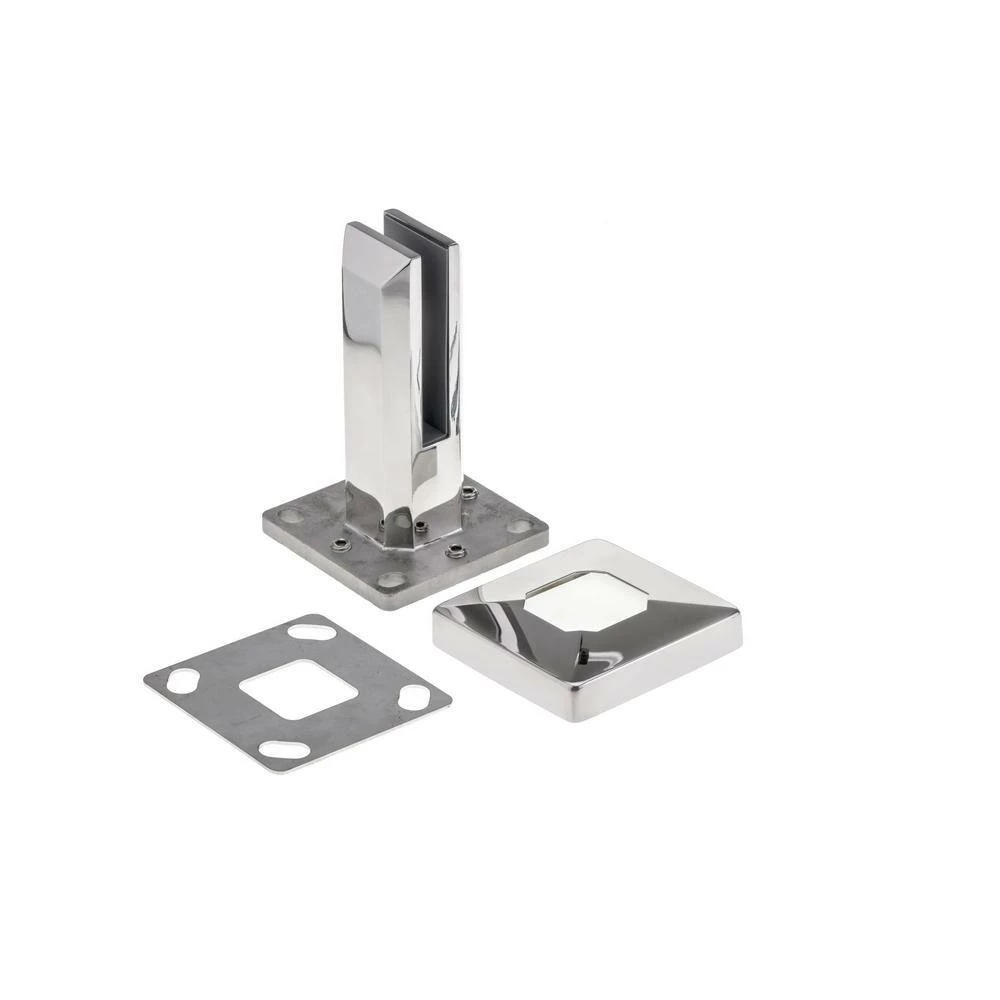 This square glass bracket with a drilling and adjustment level screw is designed to meet the increasing safety needs when installing balustrades with laminated glass that require drilling, since compression isn’t enough to keep the glass in place. The bracket has 4 adjustment screws at the base with a stainless steel plate to adjust the level and alignment of a series of panels when the horizontal surface is slightly uneven. These clamps are designed for a surface installation of glass panels, either inside or outside, such as around decks and pools.