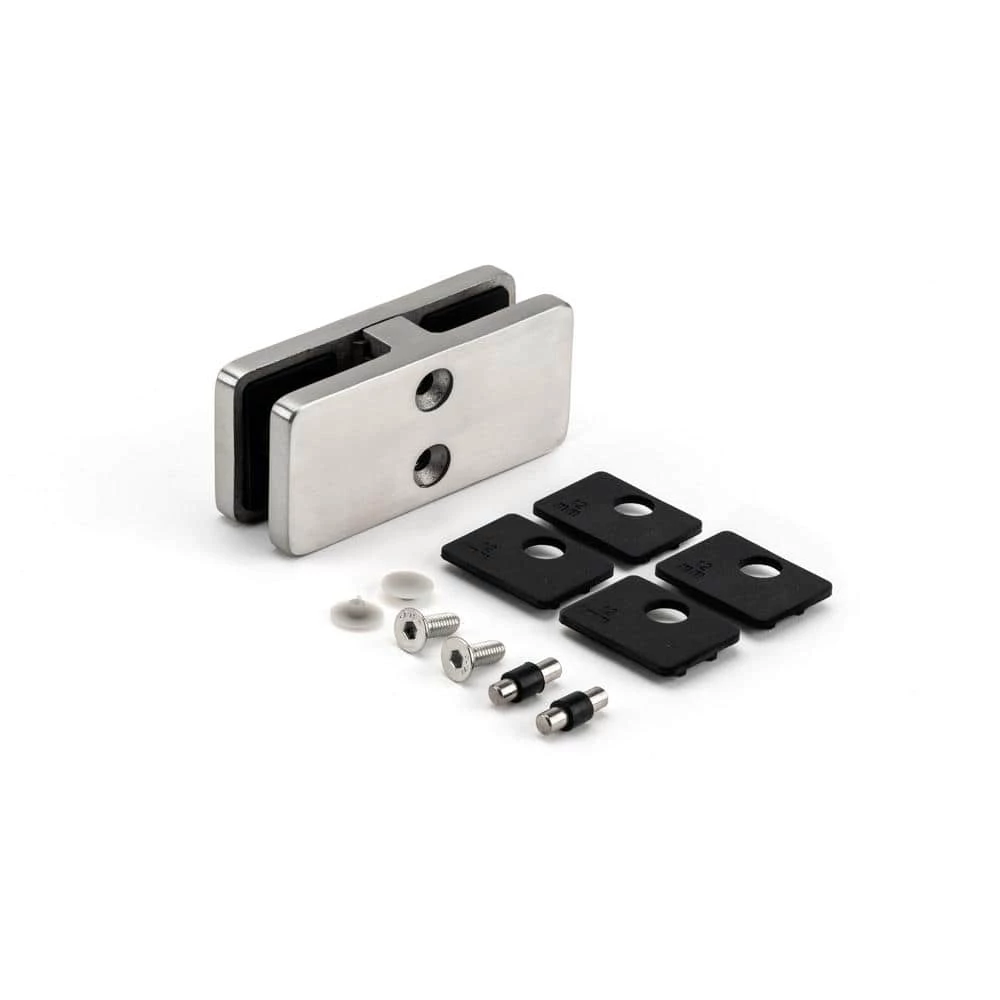 This 180° glass connector with square ends is designed to connect 2 glass panels in a continuous line in a safety glass barrier around a pool or patio. Made of stainless steel, the connector is ideal for all indoor and outdoor glass guardrail projects, such as staircases and balustrades. The connector provides a clear and open view by minimizing visual obstructions, and comes with an optional safety pin to hold the glass in place and prevent it from sliding.