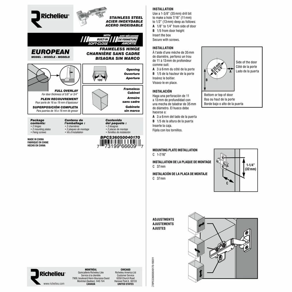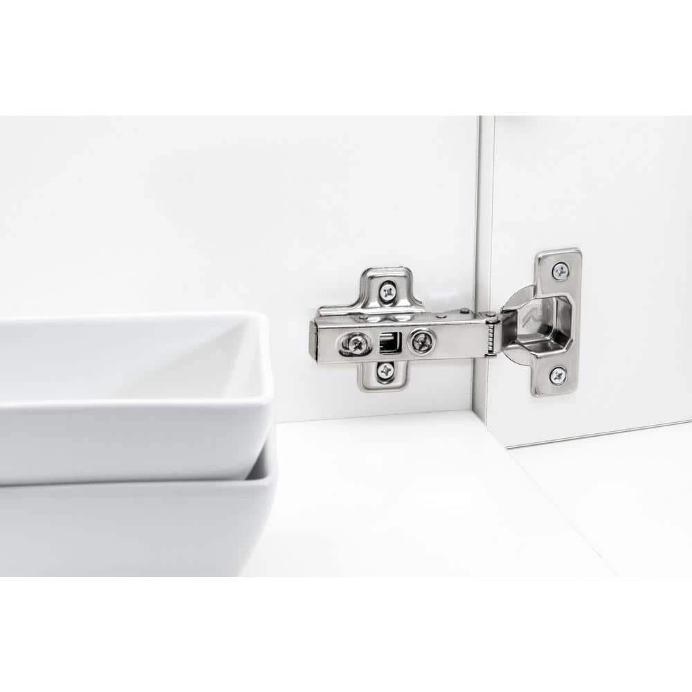 - Model offered with integrated soft-close mechanism, easy and quick installation, no tools required, simply clip the hinge onto the mounting plate, to retract the hinge, press lightly on the discreet lever button found at the back of the hinge arm, integrated adjustment system allows to adjust your door in terms of depth and lateral overlay