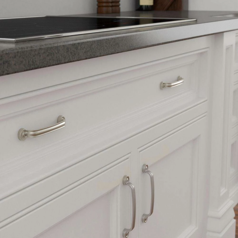 Pronounced contours and rounded feet characterize this smooth and attractive pull. Ideal for traditional furniture and cabinetry. Please note that the screws included with the products are a standard size of 1 in. (25 mm) L, quadrex, pan head. They will fit with most of the popular melamine thicknesses, which range between 5/8 in. to inches (16 mm to 19 mm).