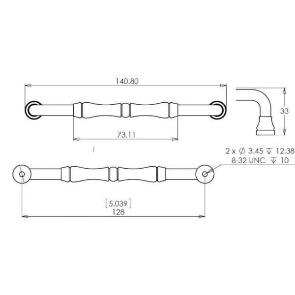 - Center to Center measurement (distance between the drill holes) : 5 1/16 in (128 mm)